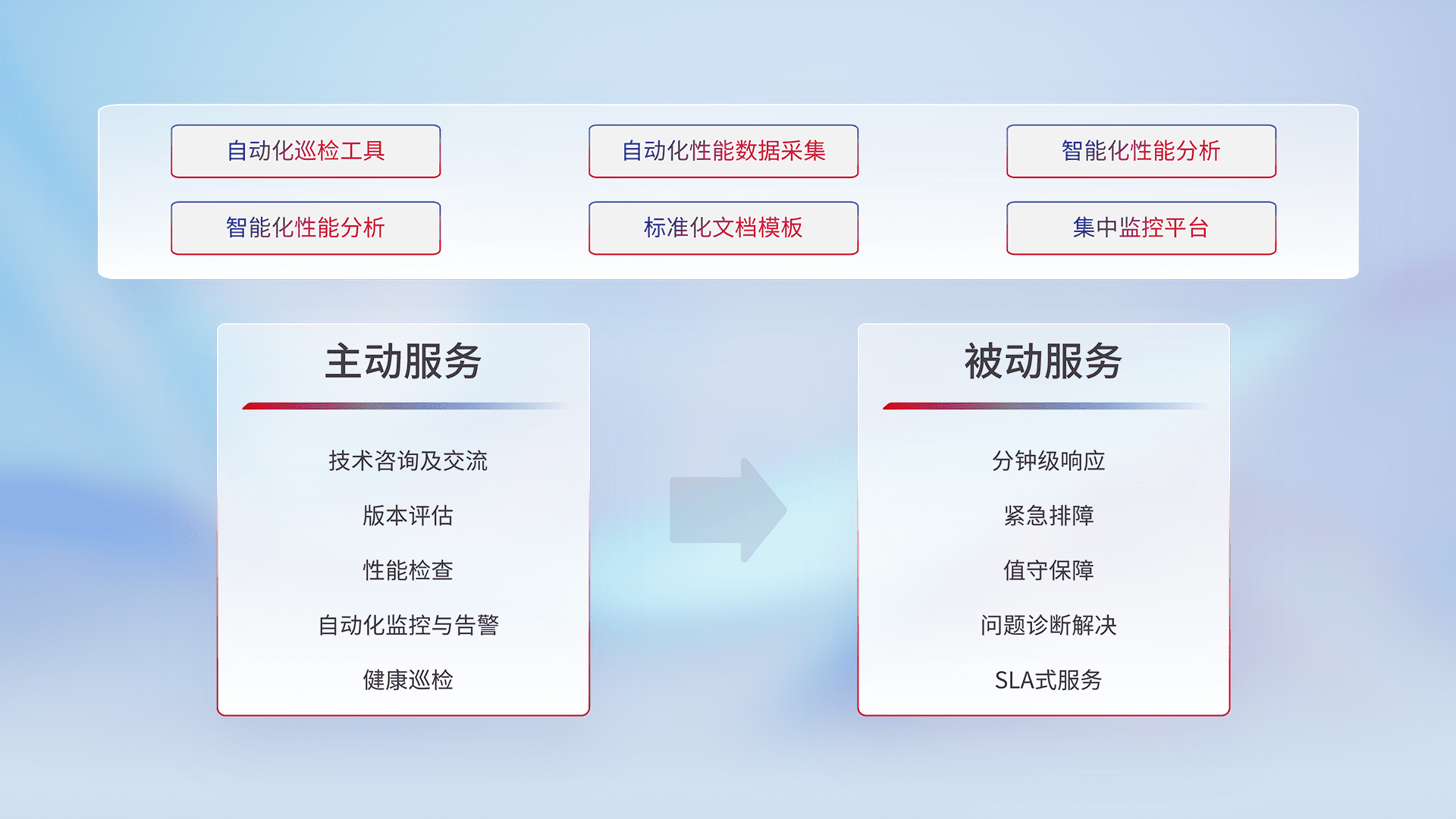 智能化工具和标准化文档,,保障服务质量,,,提供主动服务(包含技术咨询、、、版本评估、、、、性能检查、、、、自动化监控与告警、、、、健康巡检)和被动服务包含(分钟级响应、、紧急排障、、、、值守保障、、、问题诊断解决、、SLA服务)。。